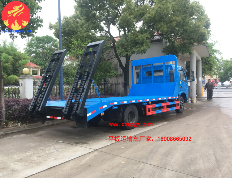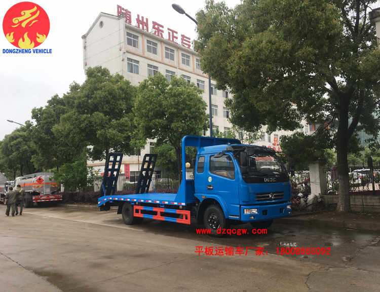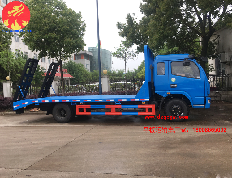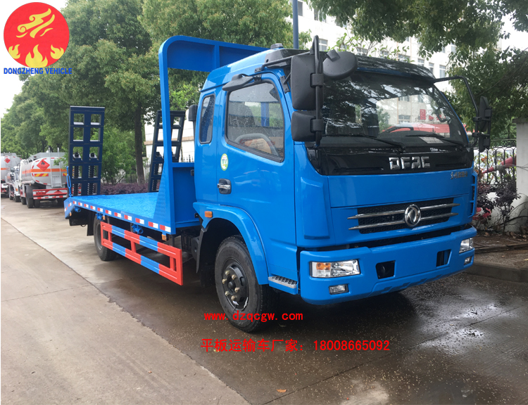 該平板運(yùn)輸車采用東風(fēng)多利卡排半駕駛室,4400mm軸距,玉柴150馬力或朝柴156馬力柴油國(guó)五發(fā)動(dòng)機(jī),帶燃油和環(huán)保,8.25的鋼絲胎,ABS。板的尺寸5.5米X2.3米,斜坡長(zhǎng)60mm,后雙彈簧,帶爬梯,龍門架上帶工具箱。