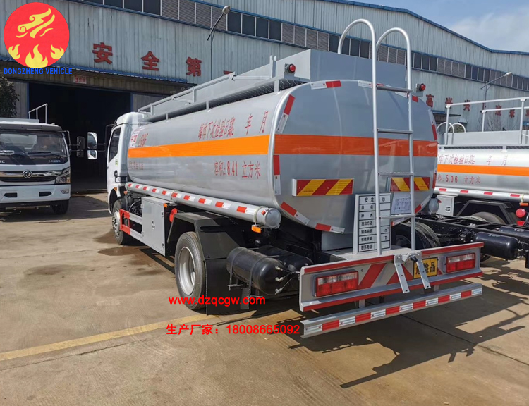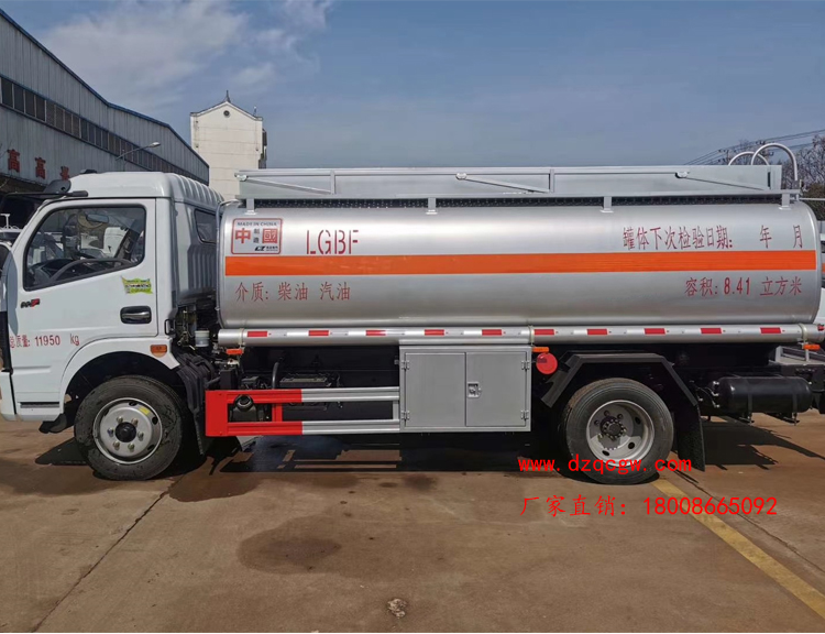 罐體容積10.3m3,罐體采用4.2mmQ235B鋼板制作,壹個(gè)鋁合金歐式罐口,專用油泵,可自吸自排,泵的出口在右邊,一個(gè)鋁合金海底閥(加裝聲光報(bào)警),正星大流量加油機(jī)及15米卷盤,加油機(jī)下掛至正駕一側(cè)。一套油氣回收裝置,一套防溢漏報(bào)警裝置,一個(gè)下裝口,一個(gè)靜電線盤,罐頂升降護(hù)欄。一個(gè)工具箱,一個(gè)防火帽,帶堵蓋,炮筒,配4KG滅火器。罐體先噴底漆再裝車,所有管道裝車時(shí)刷防銹漆,罐體金屬銀灰漆,貼反光線條及3號(hào)危險(xiǎn)品標(biāo)。